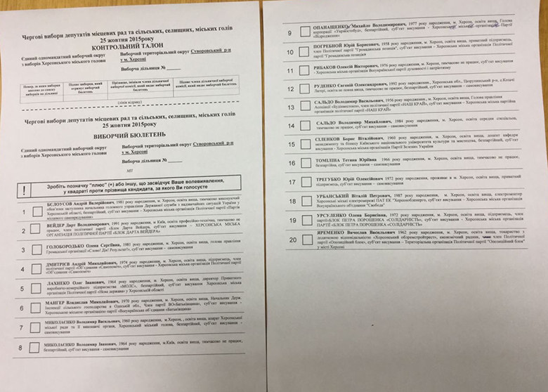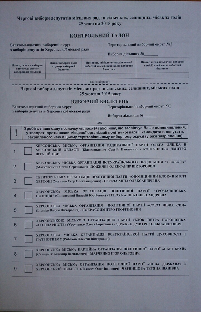 Внешний вид бюллетеней имеют вот такой (см.фото). Но это только образец(!), он на двух страницах. Настоящий бюллетень (по выборам Херсонского городского головы) будет напечат на розовом фоне, в один лист, без разрыва и оборота. Все остальное будет так, как в макете.