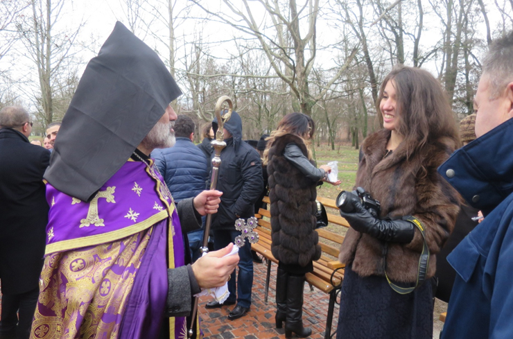 Освящение Хачкара провел глава украинской епархии армянской апостольской церкви Маркос Оганесян, который для этой цели посетил Херсон. Служба, согласно канонам, велась на древнеармянском языке.