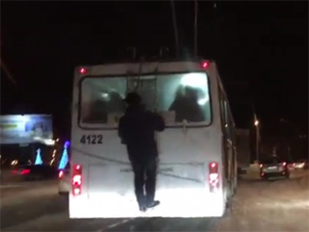 В Херсоне водитель троллейбуса, ехавшего вечером по маршруту № 12, взглянул в зеркало заднего вида, и обомлел: на лестнице сзади троллейбуса висел подросток!