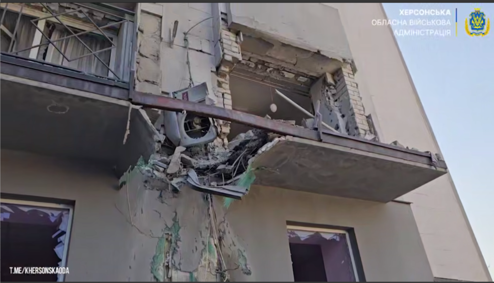 Сьогодні близько 17:00 російські війська завдали артилерійського удару по Херсону. Снаряди влучили в одну з будівель у Центральному районі міста, внаслідок чого було пошкоджено фасад, вибито вікна та зруйновано балкони.