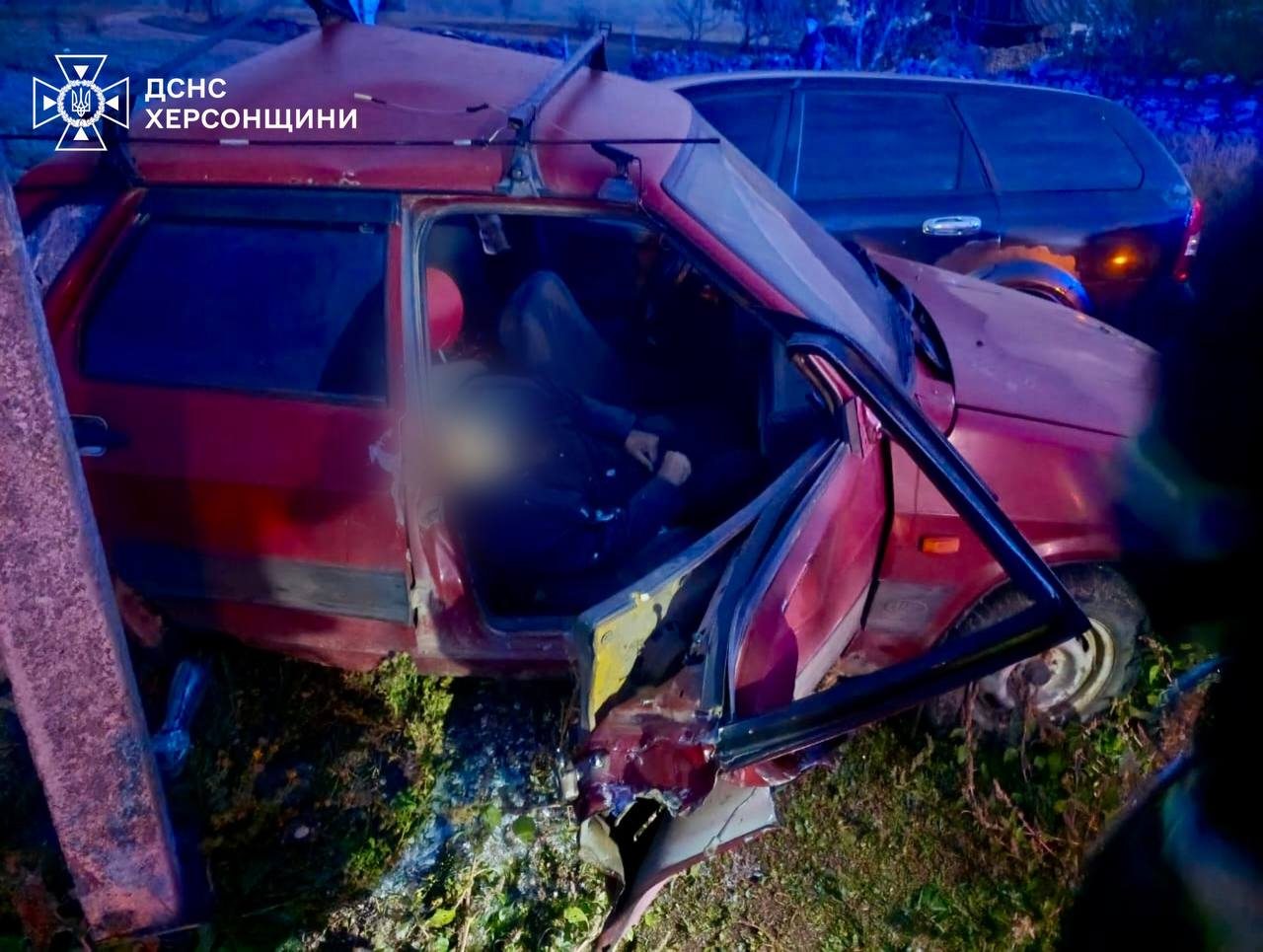 Вранці 6 жовтня у селищі Мала Олександрівка Бериславського району зіткнулися два легкові автомобілі. На місце події прибули рятувальники, які за допомогою гідравлічного інструменту деблокували тіло загиблого чоловіка з пошкодженого авто.