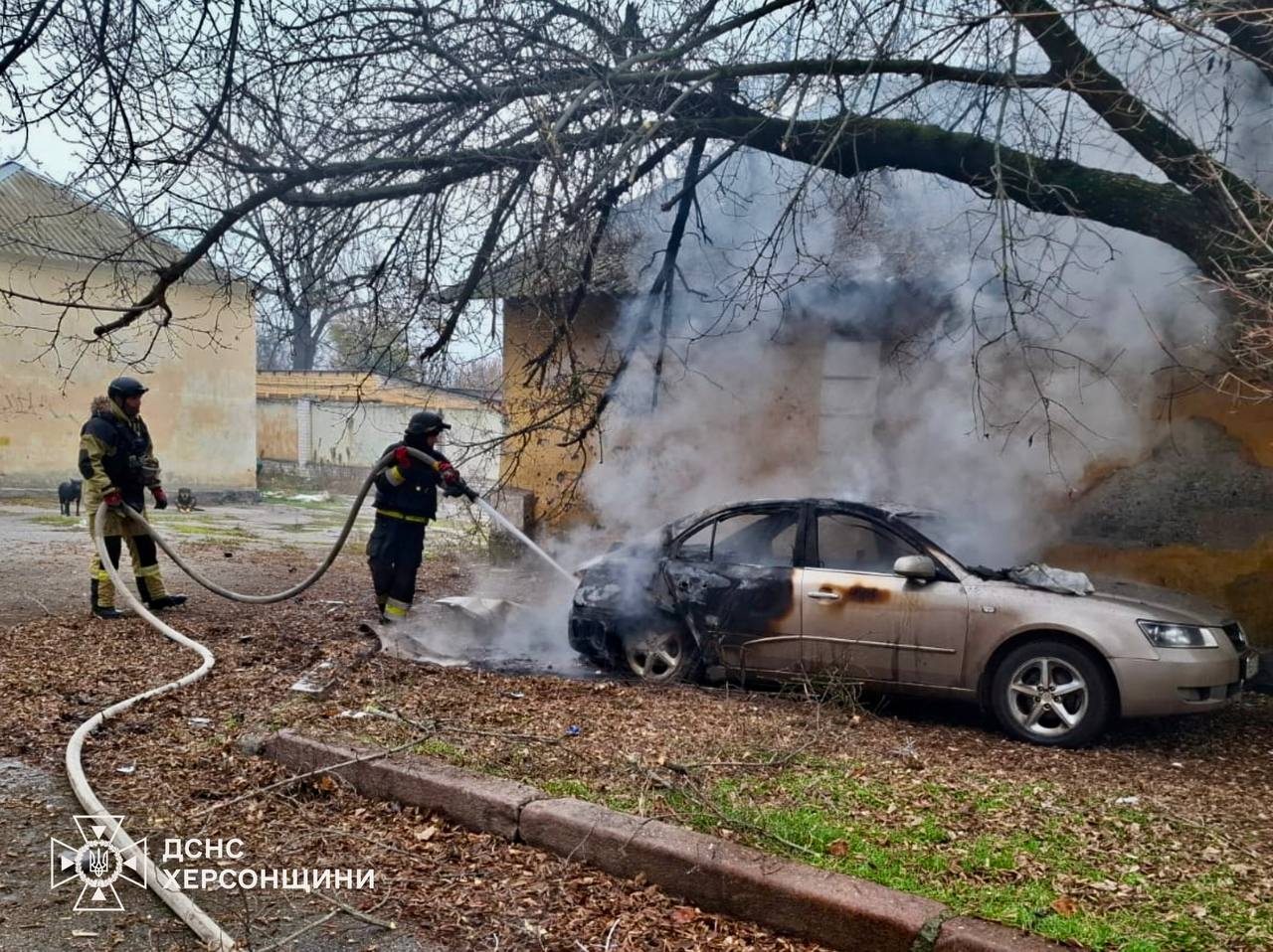 Сьогодні, 11 листопада, вдень у Херсоні відбулась атака ворожого безпілотника на легковий автомобіль. Внаслідок удару виникла пожежа, яка швидко охопила автівку.