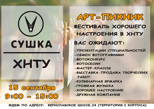 P.S. Друзі, фотографи, творчі особистості, прості фотолюбителі! Не проходьте повз! 15 вересня відбудеться перша в ХНТУ унікальна СУШКА у форматі АРТ-пікніка. А що це таке і з чим його їдять?! АРТ-пікнік включає в себе: виставку кафедр університету, фотовиставку, фотоконкурс, кулінарний ярмарок студентів, гучну музику та гарний настрій.