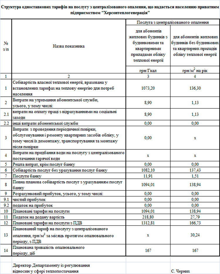 У таблиці № 1 наведений розрахунок тарифів для приватного підприємства «Херсонтеплогенерація».