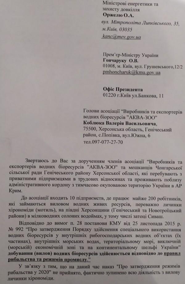 Першими тривогу забили у асоціації «Виробників і експортерів водних гідробіонтів «Аква-Зоо». В складі Асоціації знаходиться 10 підприємств, які займаються виловом водних живих ресурсів, переважно личинки хірономіди, на території Генічеського та Новотроїцького районів. На цих підприємствах офіційно працюють більше 200 робітників, які зараз залишилися без роботи, а місцеві бюджети без податків.