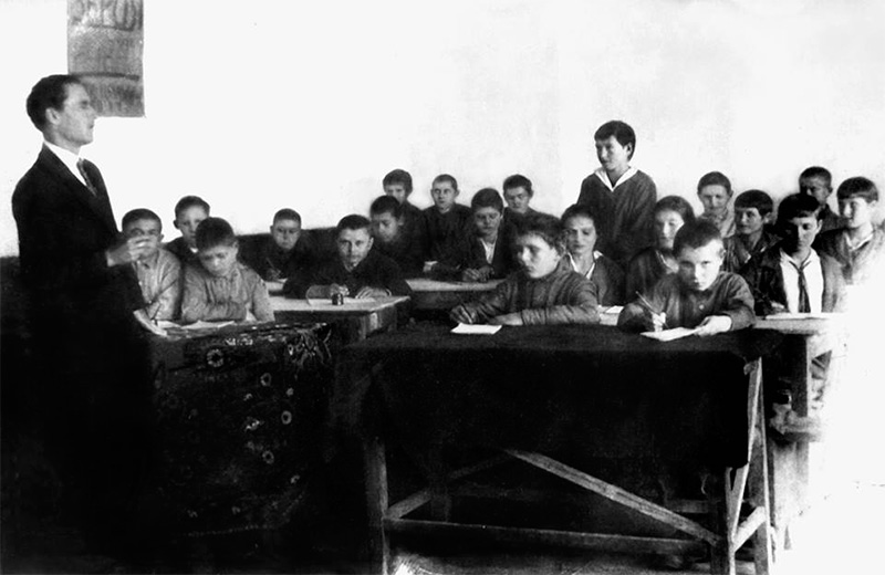 На світлинах: К. Й. Голобородько на уроці у Станіславській школі (1930-і роки) та у 1950-х роках.