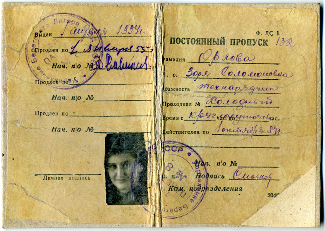 На фото: Зоря Соломонівна Орлова (1980 р.; нинішній час); пропуск З.С. Орлової на територію «зони» - Утинського гірничого комбінату (Колима).