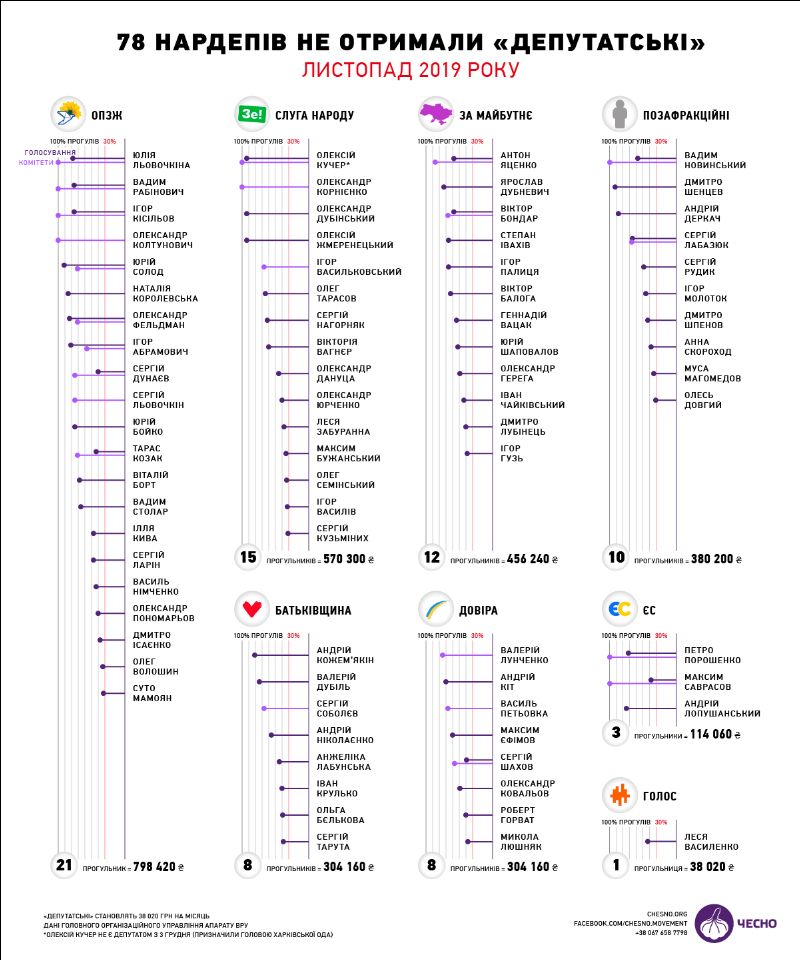 Прогульники, які не отримали кошти, були у всіх фракціях і депутатських групах, а також серед позафракційних. Однак, найбільший відсоток депутатів-прогульників виявився у фракції ОПЗЖ: там 50% нардепів не отримали "депутатських".