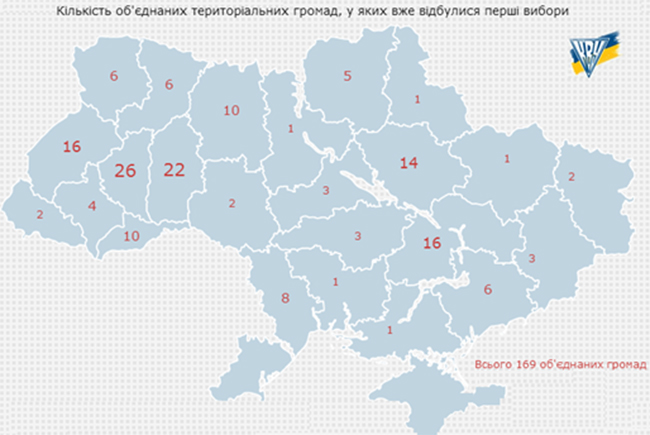 Загалом найбільше об'єднаних громад, у яких вже пройшли перші вибори, утворено у Тернопільській та Хмельницькій областях: 26 та 22 відповідно. По 16 ОТГ утворено у Львівській та Дніпропетровській областях, 14 – у Полтавській, по 10 – у Чернівецькій та Житомирській. У Вінницькій, Закарпатській та Луганській областях – по 2.