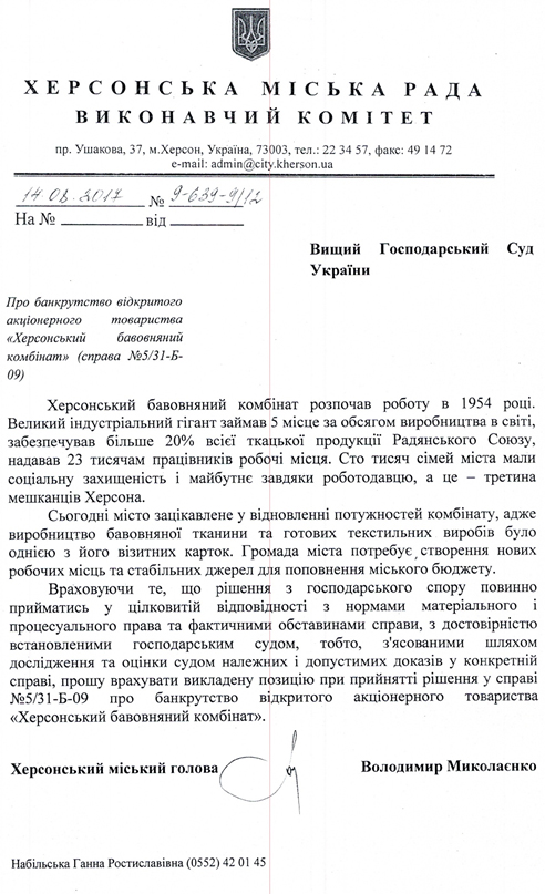 Осознавая в полной мере ситуацию вокруг хлопчатобумажного комбината, ''многообещающий' господин Миколаенко, позиционирующий себя «истинным патриотом», на письмо хебековцев отделался пустой отпиской. Копию письма прилагаем, чтобы херсонцы знали и фамилию того, кто готовил эту бумажку мэру на подпись...