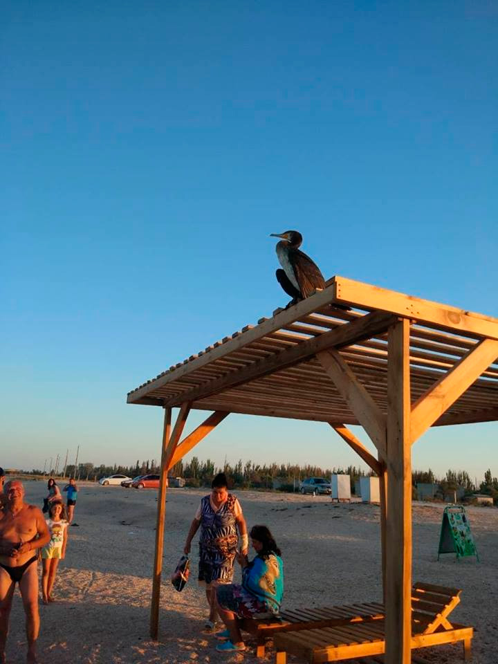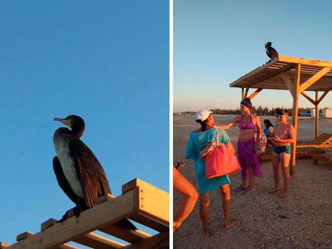 Этот азовский баклан ведет себя не просто уверенным "хозяином" пляжа, но и вполне дружелюбно реагирует на людей, позируя для совместных селфи и давая возможность притронуться к себе.