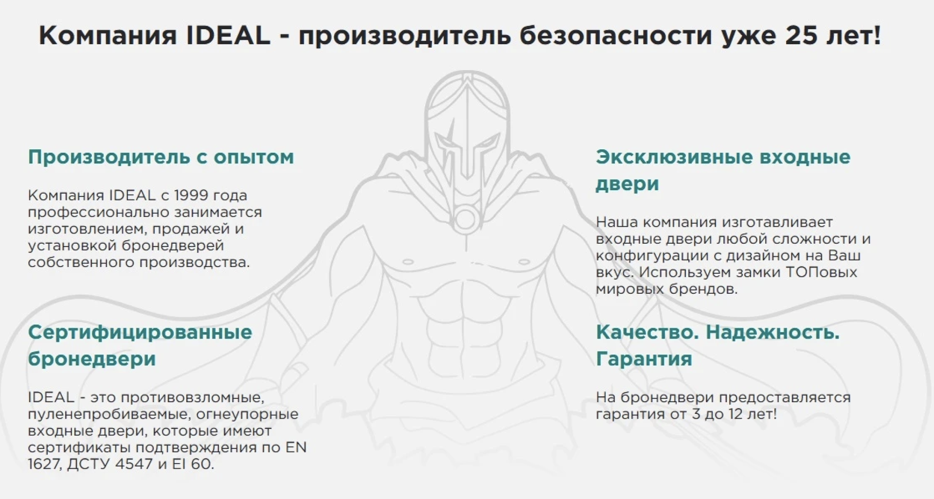 Компанія IDEAL більше 25 років виробляє вхідні двері для квартир, будинків та комерційних приміщень. Основні переваги: