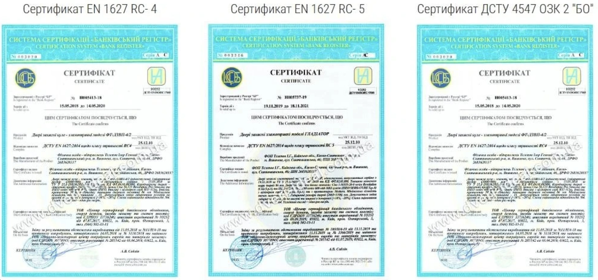 Тільки наявність оригінального сертифіката гарантує, що двері дійсно відповідають заявленим характеристикам. При замовленні у виробника IDEAL можна запросити копії всіх документів, що підтверджують клас захисту конкретної моделі.