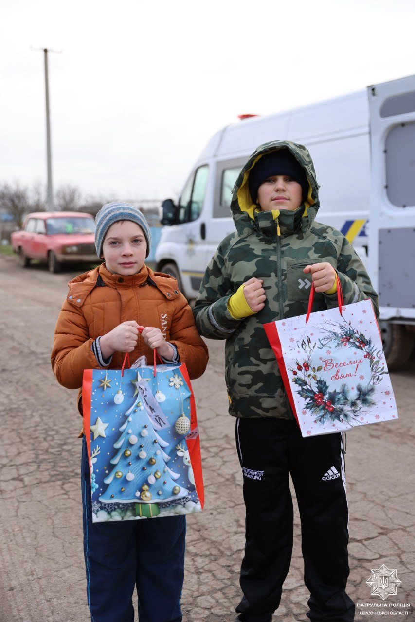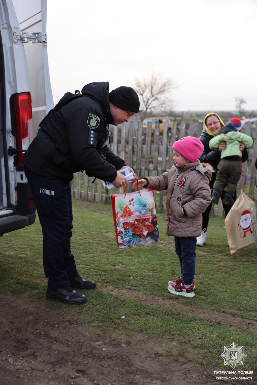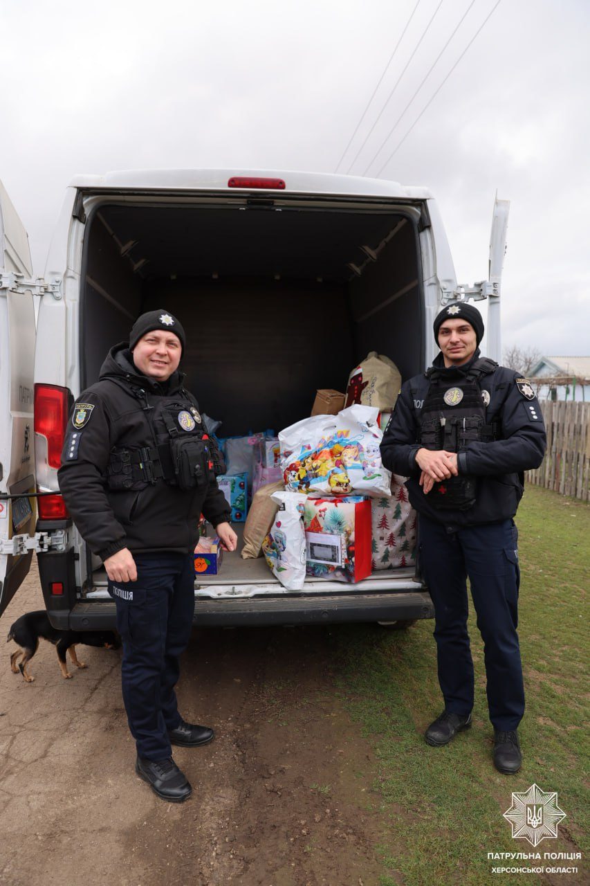На Різдво подарунки передали Управлінню патрульної поліції Херсонської області. Херсонські патрульні, своєю чергою, доставили їх дітям, подарувавши їм радість, щирі емоції та відчуття свята.