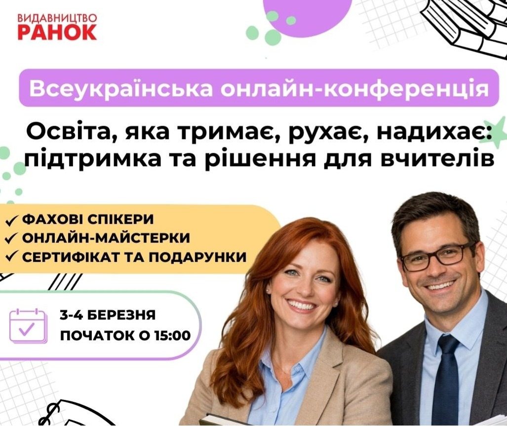 3 та 4 березня 2026 року відбудеться Всеукраїнська онлайн-конференція для педагогів «Освіта, яка тримає, рухає, надихає: підтримка та рішення для вчителів». Організатор - видавництво «Ранок».