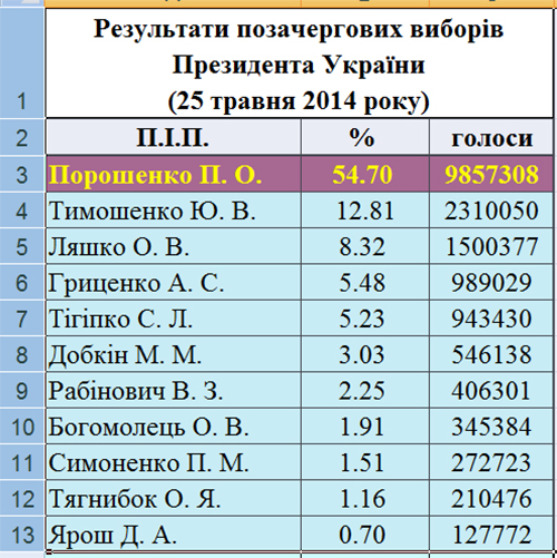 Вже у першому турі Порошенко набирає максимальну кількість голосів – 54,7%.