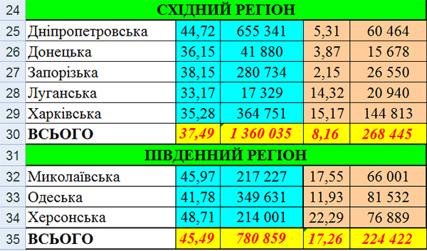 У Східному регіоні (Дніпропетровська, Донецька, Запорізька, Луганська, Харківська області) – 37,49 (3 402 812 голосів).