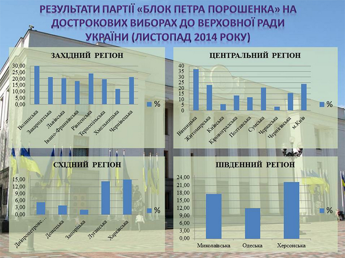 Захід віддав Порошенко майже 60% своїх голосів. Центр також підтримував Порошенко активно, але трохи менше ніж Захід. Південь віддалився від Заходу вже на 14,33%, тоді, як Схід взагалі поставився до Порошенко стримано, і віддав йому найменшу кількість голосів (на 22,33% від максимуму).