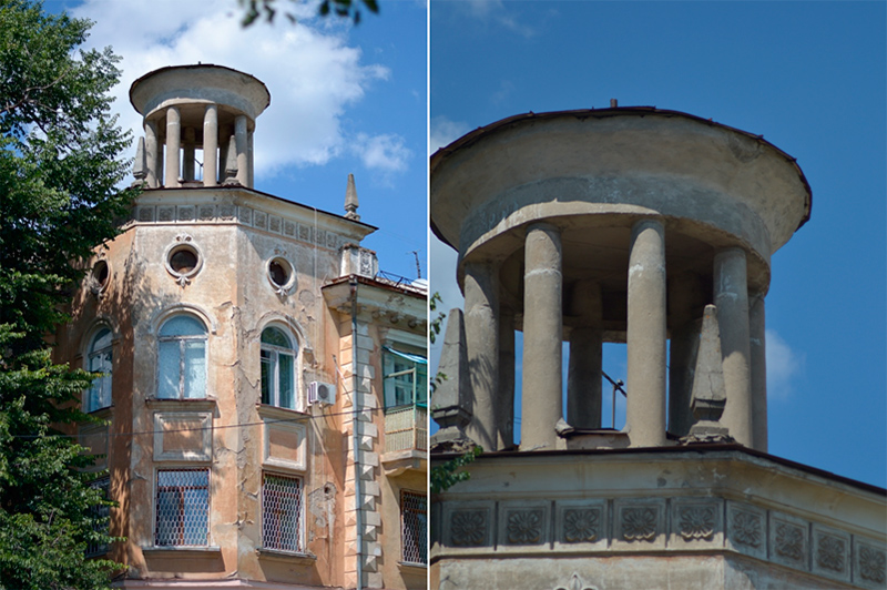А бачите на даху чи то оглядовий майданчик, чи альтанка. Як гарно збережено старовинний вигляд! І комуністична символіка нікому не заважає – не досягла туди декомунізація!!! Вже й прадавні тополі проросли. Хтось запчастини для будівництва дирижаблю «Херсонбург» там наскладав. Хто казав, що у нас мало історичних пам'яток?