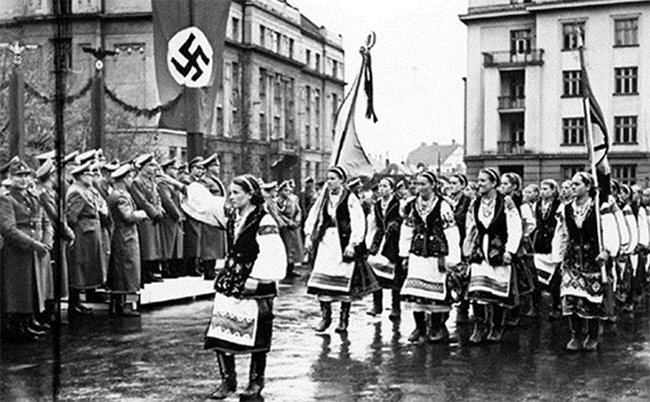 Затем, повесив портрет другого усача, убедительно говорил: - А це, діти, справжній друг українського народа, німецький фюрер Адольф Гітлер, який піклується про кожного маленького і дорослого українця!
