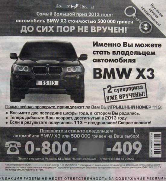 Теперь по сути. Открыв газету, вы увидите объявление о том, что в ходе акции, проводимой некой компанией «именно Вы можете стать владельцем автомобиля BMW X3"