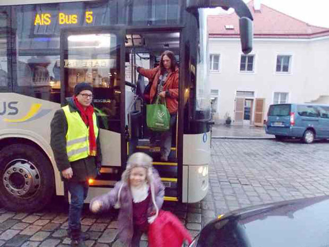 Садимся в автобус. Он такой же по классу, как в Вене, но...бархат сидений облезлый, засаленный, подранный. Всё грязное, болтается, стучит, дребезжит. Едет так, что летаем по салону как гвозди в жестянке.