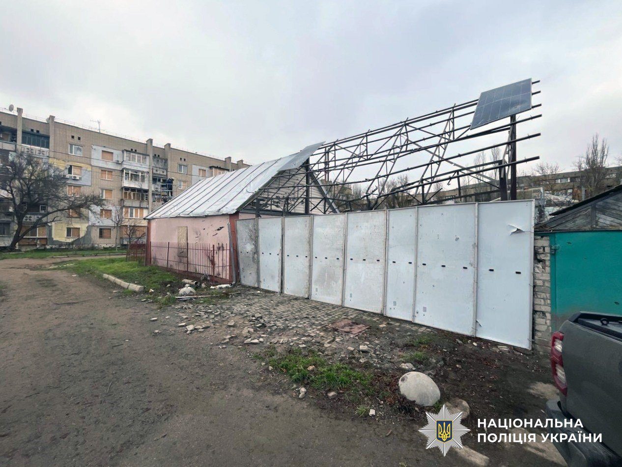 Протягом дня удари також накривали Дніпровський район Херсона. Там поранено 46-річного чоловіка - він зазнав мінно-вибухової травми та уламкового поранення голови. Пошкоджено навчальний заклад, два багатоквартирних будинки, 13 приватних осель, гаражі, майстерню та літні кухні.