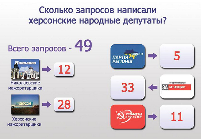 Всего наши депутаты направили 49 запросов, причем мажоритарщики 28, а партийные 21. Много это или мало? Думаем, достаточно, в соседней Николаевской области тоже пять мажоритарщиков, а у них всего 12 запросов.