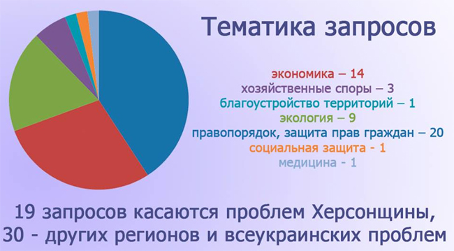 Большинство запросов – 20, касались защиты прав граждан и соблюдения законности. 14 вопросов – экономики, 9 – экологии. 3 запроса были направлены по поводу возникших хозяйственных споров. По одному касались вопросов охраны здоровья, благоустройства территорий и социальной защиты граждан.