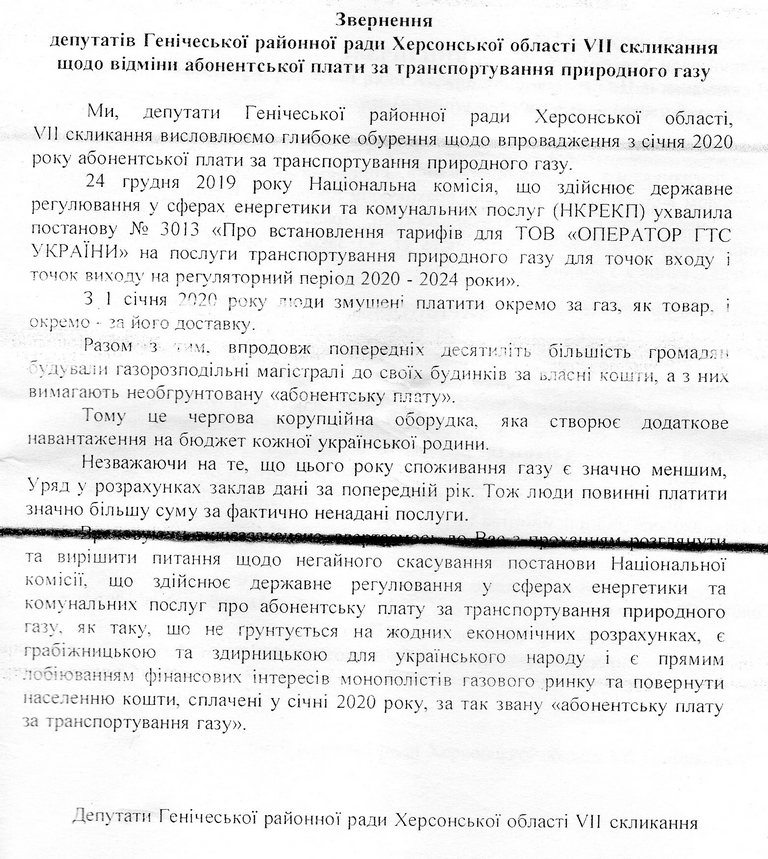 Депутати Генічеської районної ради підтримали своїх колег з Чаплинки та прийняли звернення до Президента, Кабінету Міністрів та Верховної Ради України де вимагають скасувати абонентську плату на транспортування природного газу.