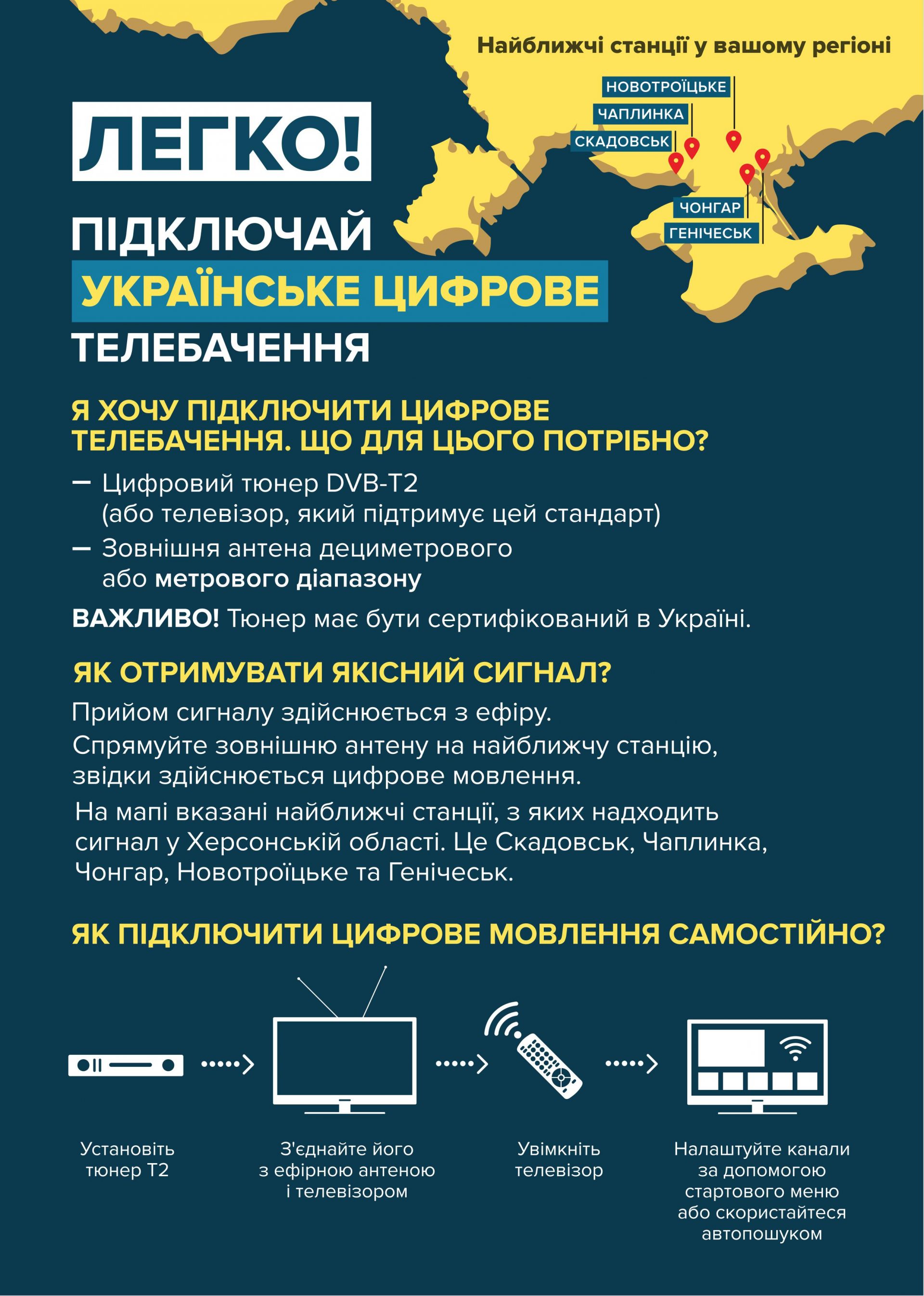 Для того, чтобы жителям Херсонщины наладить цифровой приём дома украинских телеканалов необходимо приобрести сертифицированный в Украине цифровой тюнер DVB-T2, который подключить к обычному телевизору, или иметь телевизор, что поддерживает цифровой стандарт. Также нужна направленная антенна дециметрового даипазона. Её необходимо развернут в направлении на ближайший источник сигнала из числа пяти, отмеченных на карте.