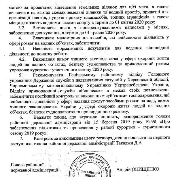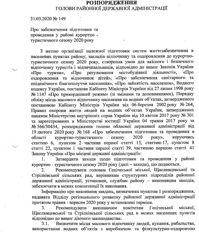 Голова Генічеської райдержадміністрації Андрій Онищенко підписав розпорядження про забезпечення підготовки та проведення у районі курортно-туристичного сезону 2020 року.
