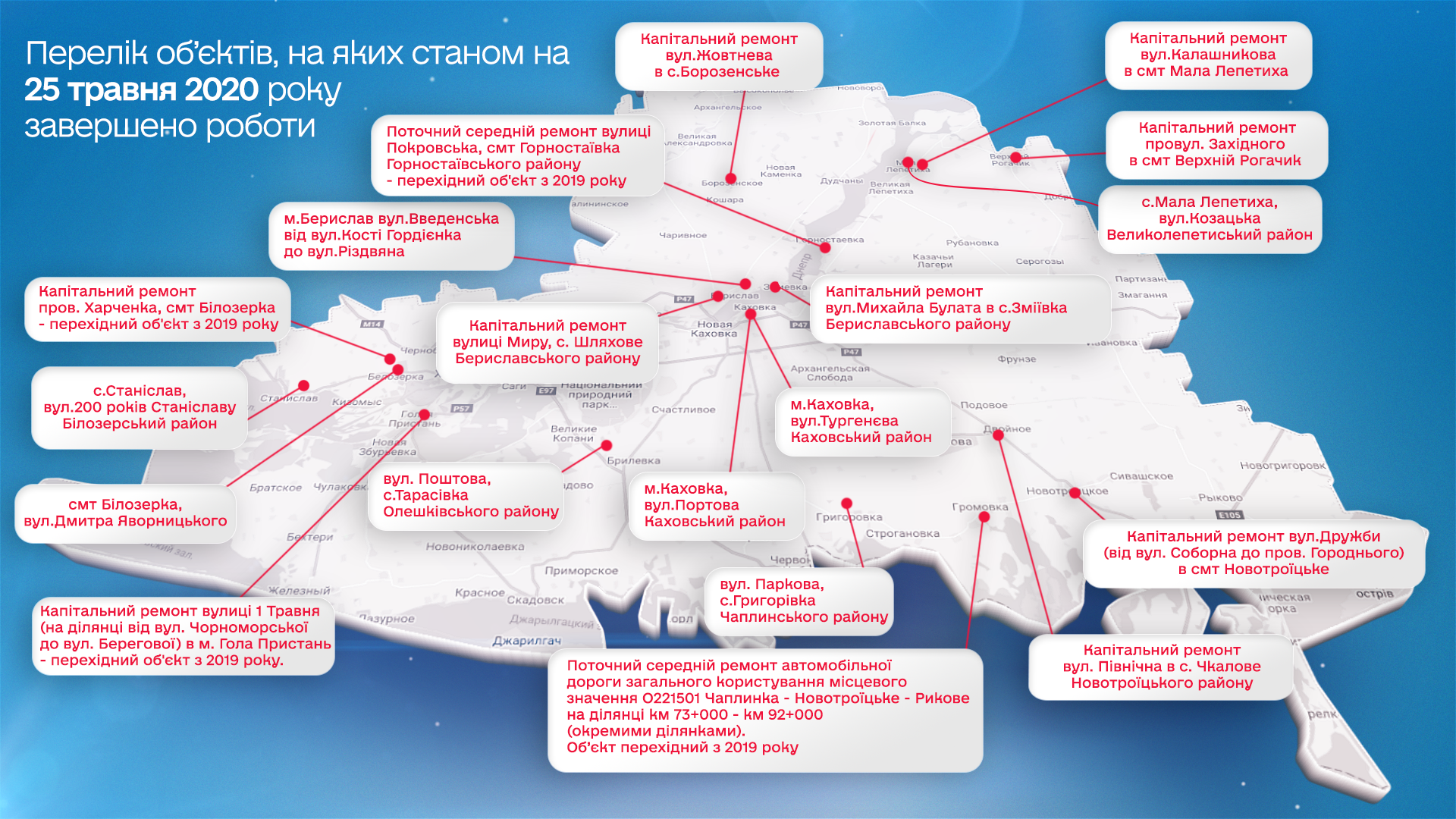 В рамках проекта "Большое строительство" на Херсонщине отремонтировано 19 дорог (см. карту). Речь идет о государственных дорогах местного значения и дорогах коммунальной собственности общего пользования. Об этом сообщает Херсонская облгосадминистрация.
