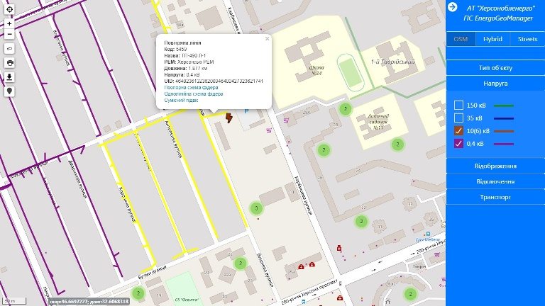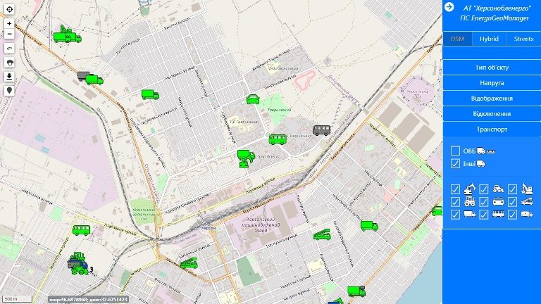 Сегодня в распоряжении энергетиков есть удобный функционал, который позволяет контролировать почти все процессы производственной деятельности, определять размещение электрических сетей разных уровней напряжения, протяженности воздушных линий, адреса и названия трансформаторных подстанций, их принадлежность (РЕМ или абонент), мощности распределительных подстанций. В том числе, ГИС сочетает в себе систему контроля транспорта. Для облегчения пользования системой создан поиск. Сервис максимально наполнен технической информацией об энергетических объектах Херсонской области, что существенно влияет на оперативность выполнения поставленных задач. При наполнении ресурса главный акцент был направлен на удобство, доступность и достоверность информации, собранной в единое целое.