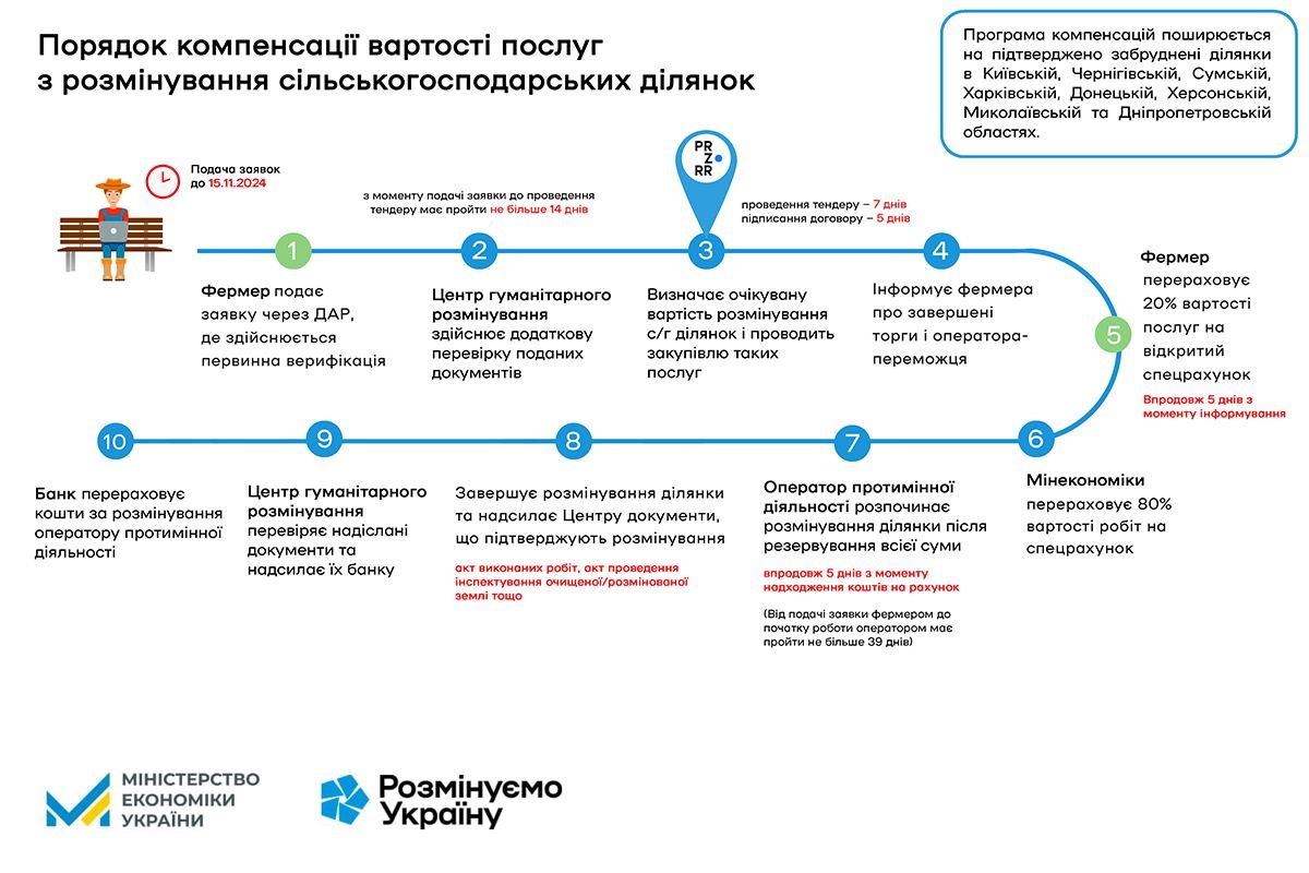 Держава компенсуватиме 80% вартості розмінування ділянки фермерам, які працюють на власній чи орендованій землі. Ціна на послуги з розмінування визначатиметься на відкритих торгах в системі Prozorro.