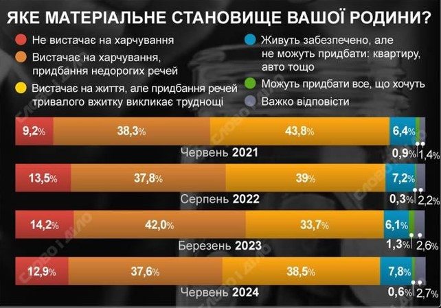 Водночас дуже мало українців, хто, за їхньою оцінкою, може купити все, що забажає. У 2021 році на такому рівні себе оцінили 0,9% опитаних, у 2022-му – лише 0,3%. Трохи цифра зросла у 2023 – до 1,3%, проте у 2024 році знову опустилася до 0,6%.