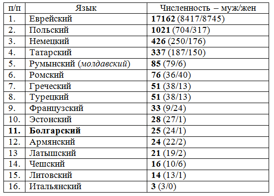 * Здесь наблюдается противоречие между данными таблицы XI - «Распределение иностранных подданных по государствам» и таблицы ХХIV - «Распределение населения по родному языку, сословиям и состояниям», в которых приведены разные цифры о количестве иностранных подданных - болгар (35 и 5 соответственно) в городе Херсоне.