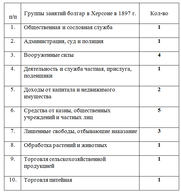 ТАБЛИЦА III: Распределение болгар в г.Херсоне по группам занятий в 1897 г. (по данным таблицы ХХII: «Распределение населения по группам занятий и родному языку» [1, с. 227])