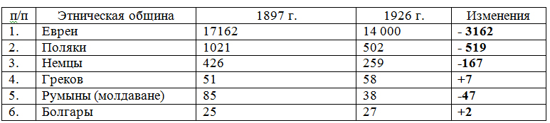 Данные переписи свидетельствуют о том, что ведущая роль в этнической жизни города принадлежала еврейской общине. В ее состав входила почти треть (29,05%) городского населения.