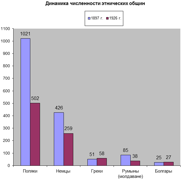 Довольно интересные цифры для сравнения с 19 веком дают нам 20-е гг. следующего столетия. В 1926 году была проведена Всесоюзная перепись населения. Ее цифры дают некоторое представление о том, как события 1-й мировой, революции и гражданской войны повлияли на ситуацию в некоторых этнических общинах города Херсона.