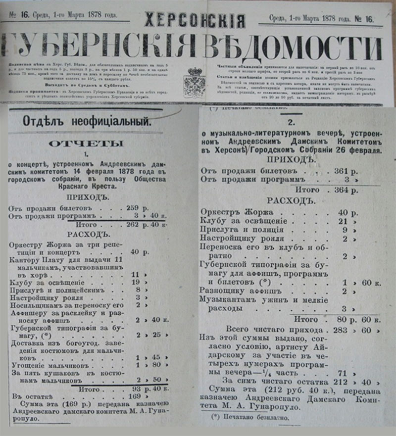 Ключ к некоторым ответам, возможно, находится в отчетах Андреевского дамского комитета. В 1878 году 14 и 26 февраля комитет провел в Херсоне два литературно-музыкальных вечера в пользу Общества Красного Креста (средства собирались для лечения солдат, получивших ранения на полях сражений Балканской войны, как она тогда называлась в официальной прессе).