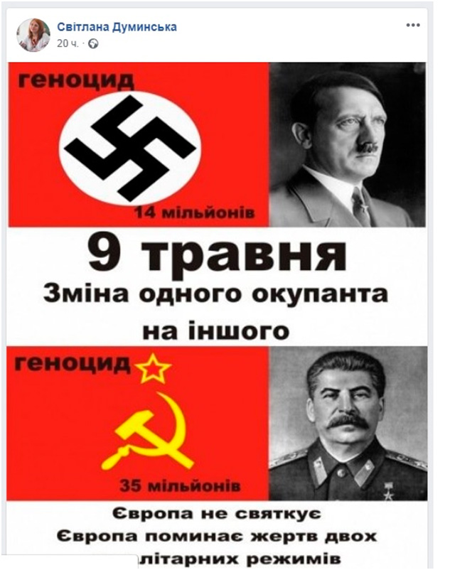 Однак, як свідчить реальність, Указ писаний не для всіх. В Херсоні його розуміють по-своєму... Зокрема, державний службовець Світлана Думинська, директор Департаменту культури і туризму Херсонської обласної державної адміністрації (яка до речі і готувала святкові заходи) на власній сторінці в мережі Facebook запостила разом радянську та нацистську символіку з надписом 09 травня – зміна одного окупанта на іншого.