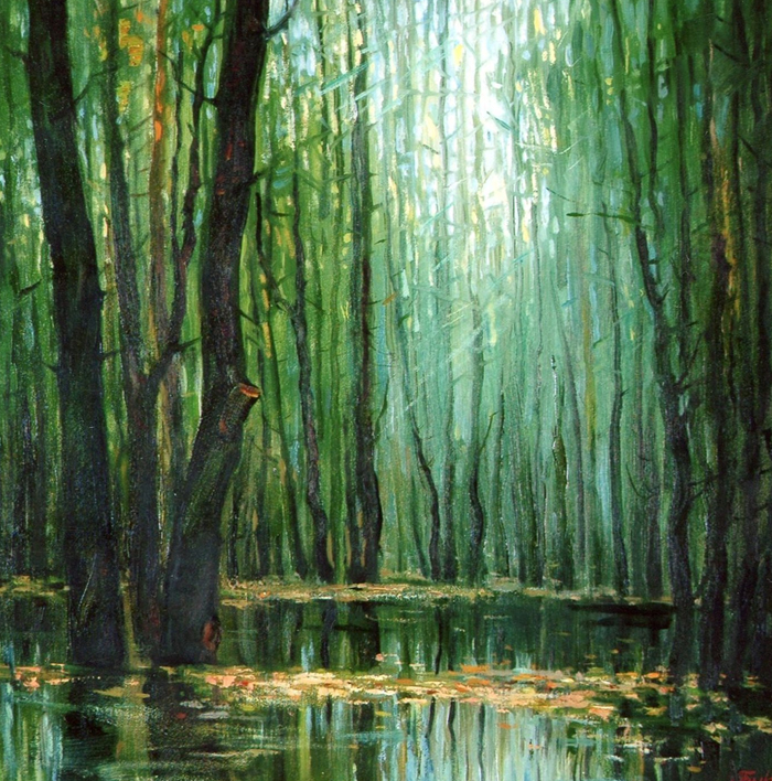 Цікава робота «Ранок» (на фото): сонце ще не просвітлює цей куточок простору, тож дуже виразними,майже фотографічно-контрастовими, видаються і сама прибережна рослинність, і човен, і місток, і їх відлуння у воді.