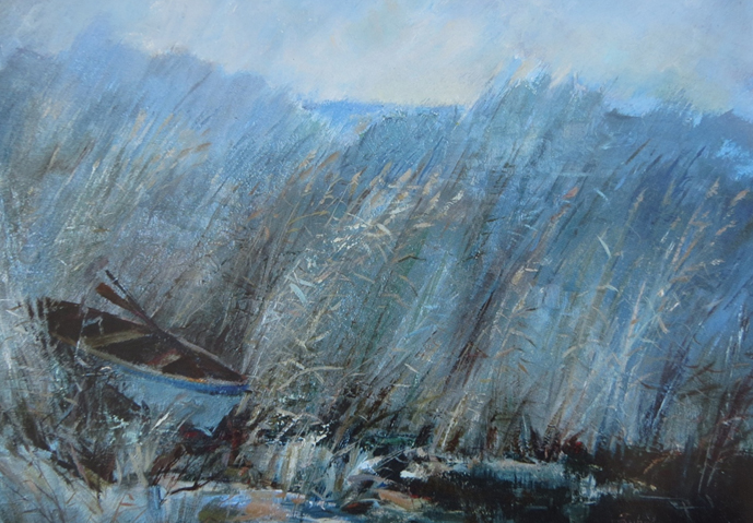 Але робота виконана у незвичайній колористичній тональності: комиші бірюзові, помережені темно-світлими пасмами, здається, вони просвітлені бірюзовим водним простором, що прилягає з тилу. Відчуття руху комишевих заростей породжується контрастом між нахиленими стеблами та застиглим човном у кутку картини.
