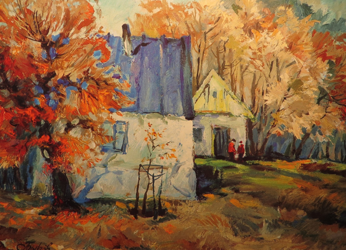 Є роботи, на яких домінує водно-земне при фрагментарно-інтригуючому небі:, «Дім рибалки», «Пробудження», «Скінчилося літо», «Вересень», «Розсип» «Осінь на дачі» (на фото):