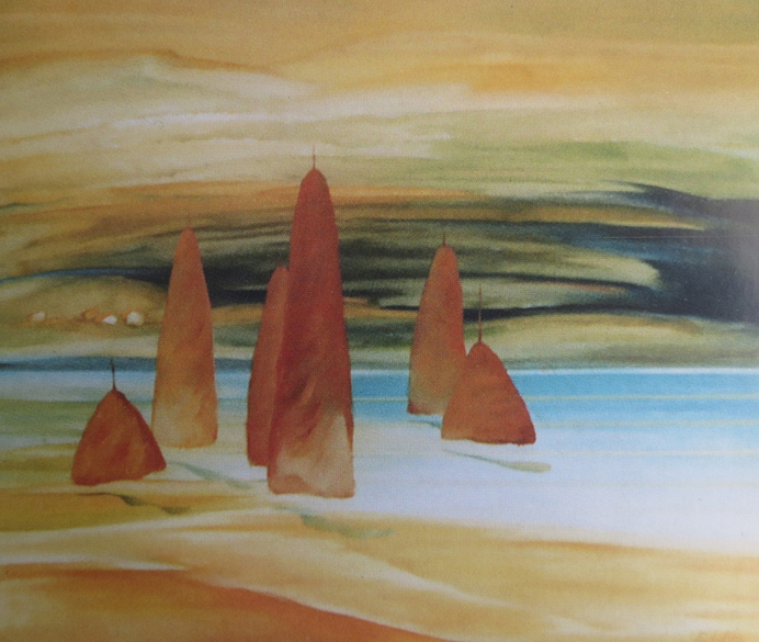 Про останню роботу. Аби підкреслити спекотність серпневого дня, художник застосовує сміливе композиційне рішення – увагу акцентує не на морі (на картині воно фрагментарне), а на жовто-гарячому піщаному пагорбі з човнами на його верхівці та на жовто-голубому небі з великими птахами. Створюється враження жовтої гарячої хвилі, пасма якої, здається, витісняють голубінь неба. Водночас наступ спекотного тепла мовби стримують своїми крилами птахи...