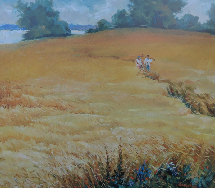 Виразно-романтичним настроєм наповнена картина «Поле дозріло»: спрагле врожаєм поле, а посеред нього –дві, ледь помітні постаті косарів...