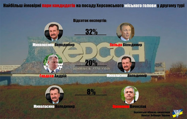 Всего эксперты называли шесть кандидатов на должность Херсонского городского головы, которые имеют шансы попасть во второй тур выборов мэра: Владимир Миколаенко, Владимир Сальдо, Андрей Гордеев, Вячеслав Яременко, Борис Силенков и Юрий Погребной.