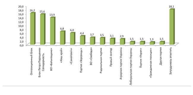 В Херсонской области за политическую партию "Оппозиционный блок" готовы отдать свои голоса 16,2% избирателей. Второе и третье место делят БПП «Солидарность» и ВО «Батькивщина», 15,6% и 13,9% соответственно. Еще не определились со своим выбором 18,1% граждан.