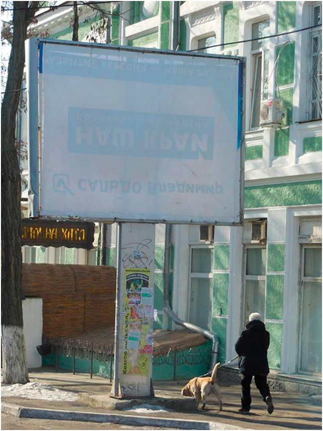 Так и поступили с агитационными бордами скандально-известного в Херсоне политика - их просто перевернули для наклейки новой рекламы, например, туалетной сантехники или лечения геморроя в частной клинике...